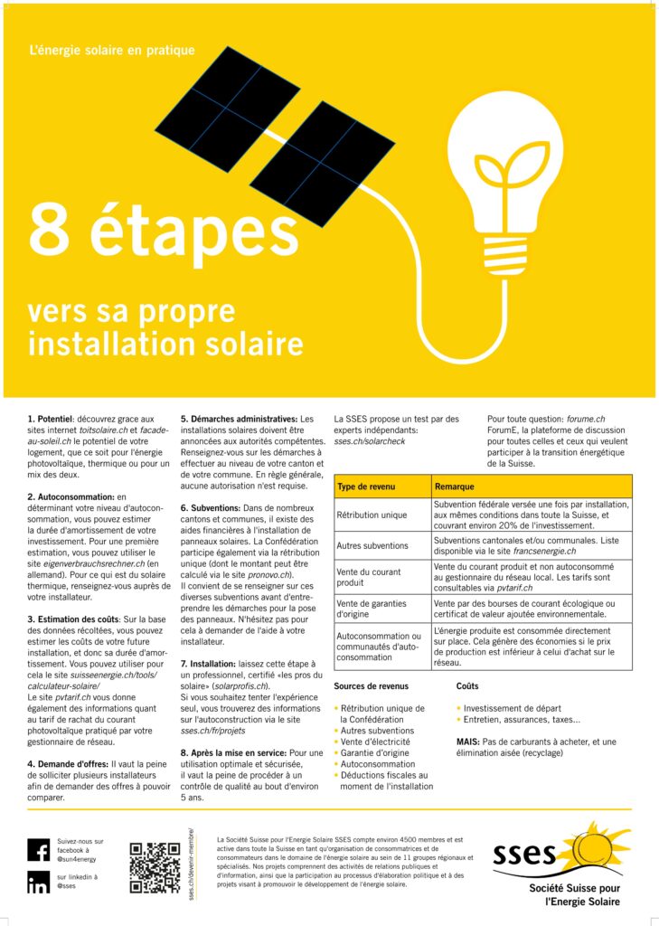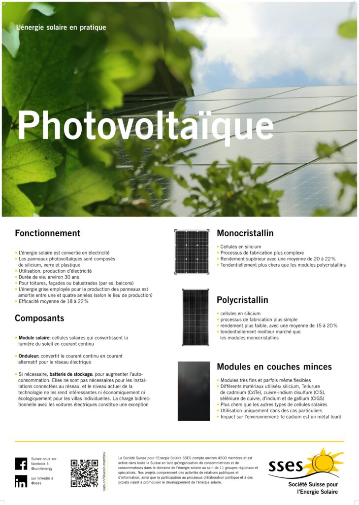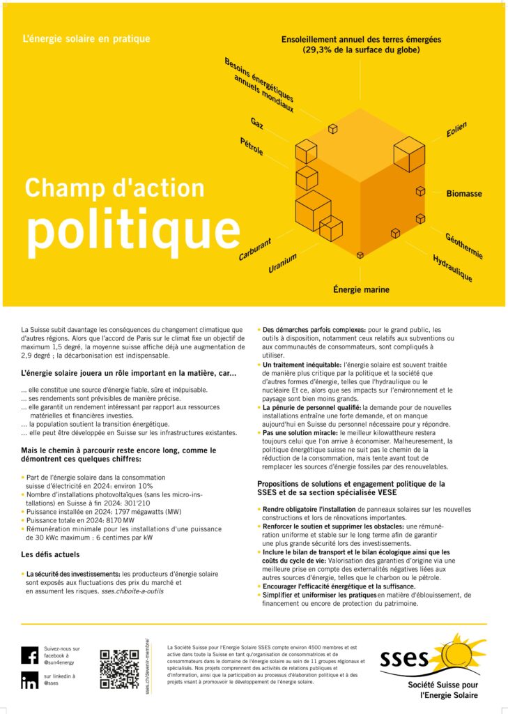 La SSES a réalisé des posters d’information durant l’été 2022 et l’automne 2025 afin d’informer de manière simple sur l’énergie solaire. Les fichiers sont régulièrement actualisés.